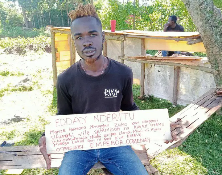 In his Facebook account, the comedian shared a photo which he posed while holding a placard scribbled with writings that expressed his feelings. The writings indicated that he was not happy with the Mugithi artist and his baby mama, nominated senator Karen Nyamu, for what they’ve been doing to Nderitu. He promised to be there for her in every endeavor as he has everything it takes to be a man.