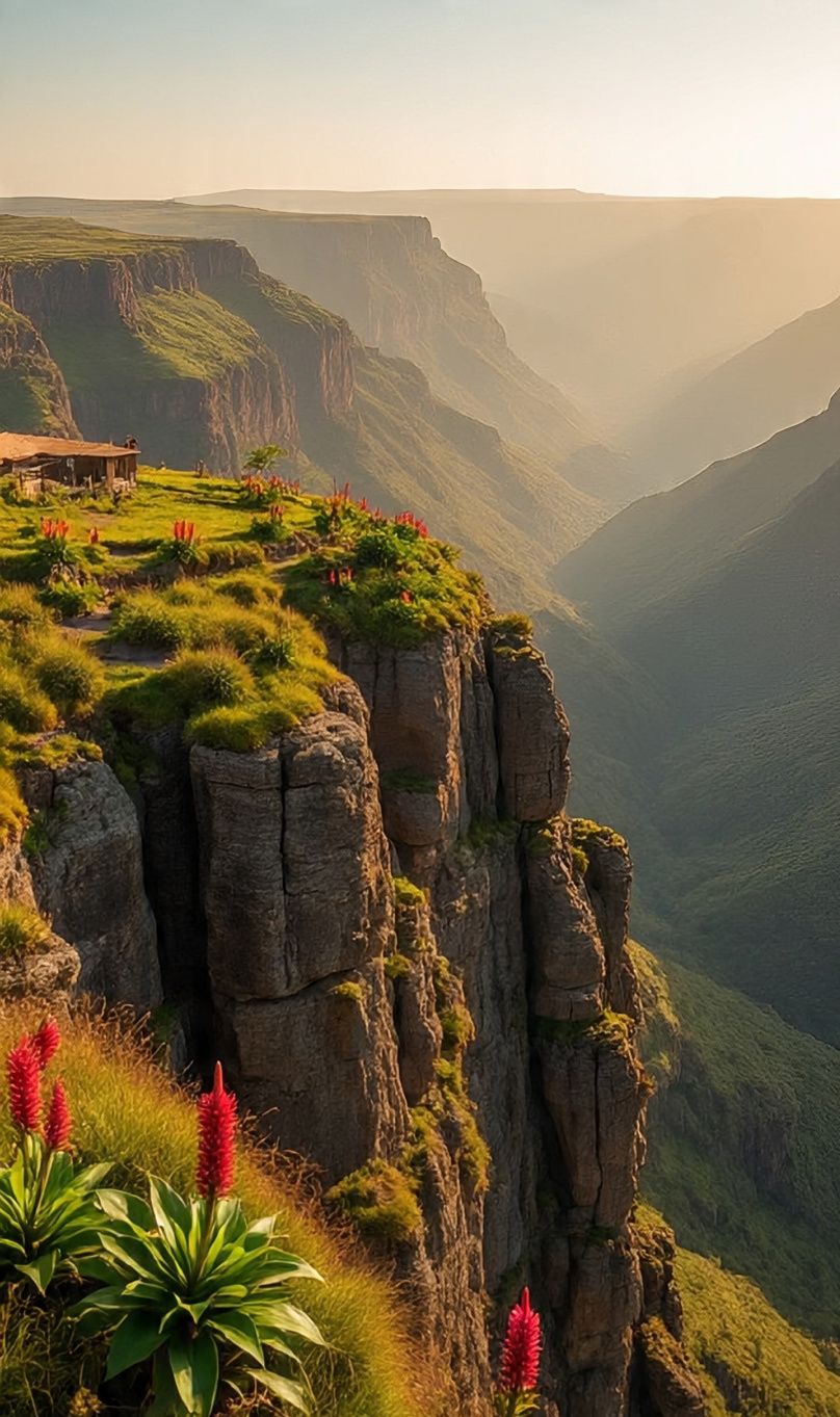 The Simiens are unlike anything I’ve seen. Rugged escarpments plunge 1,500m into misty valleys, glowing gold at sunrise. Green plateaus stretch endlessly, dotted with red hot pokers and giant lobelias. Villages cling to cliff edges. Every view stops you. Sunsets here are unforgettable.